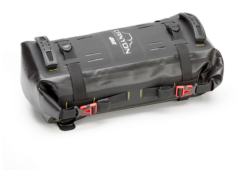 Die Tasche kann auch als Zubehör für zusätzliches Ladegut verwendet werden, wobei sie am Sattel oder an den Deckeln der Aluminiumkoffer befestigt wird. Dank der bequemen Gurte und des M.O.L.L.E.-Systems, mit dem sie ausgestattet ist, kann die Tasche auch in Kombination mit anderen Modellen der Linie Canyon verwendet werden, wie z.B. der Packtasche GRT726, wodurch sich die Konfiguration des Gepäcks erweitern und an längere und anspruchsvollere Reisen anpassen lässt.